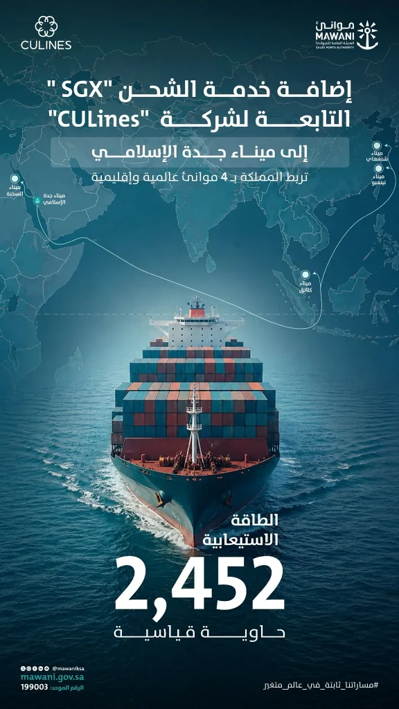 السعودية | أعلنت الهيئة العامة للموانئ “موانئ” عن إضافة شركة China United Lines CULines” خدمة الشحن الجديدة “SGX” إلى ميناء جدة الإسلامي، مما يسهم في تعزيز ربط المملكة بالأسواق العالمية، ورفع كفاءة سلاسل الإمداد، ودعم حركة التجارة عبر البحر الأحمر بوصفه أحد أهم الممرات البحرية العالمية.
