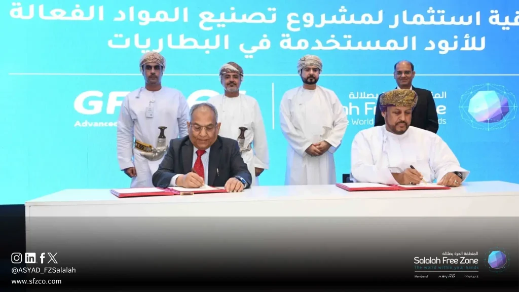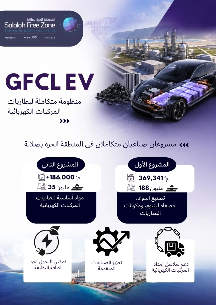 عُمان | وقّعت المنطقة الحرة بصلالة اتفاقية استثمارية مع شركة GFCL EV Advanced Materials لتنفيذ مشروع متخصص في تصنيع المواد الفعّالة للأنود المستخدمة في بطاريات المركبات الكهربائية، في خطوة تعزز توجه السلطنة نحو الصناعات المتقدمة.