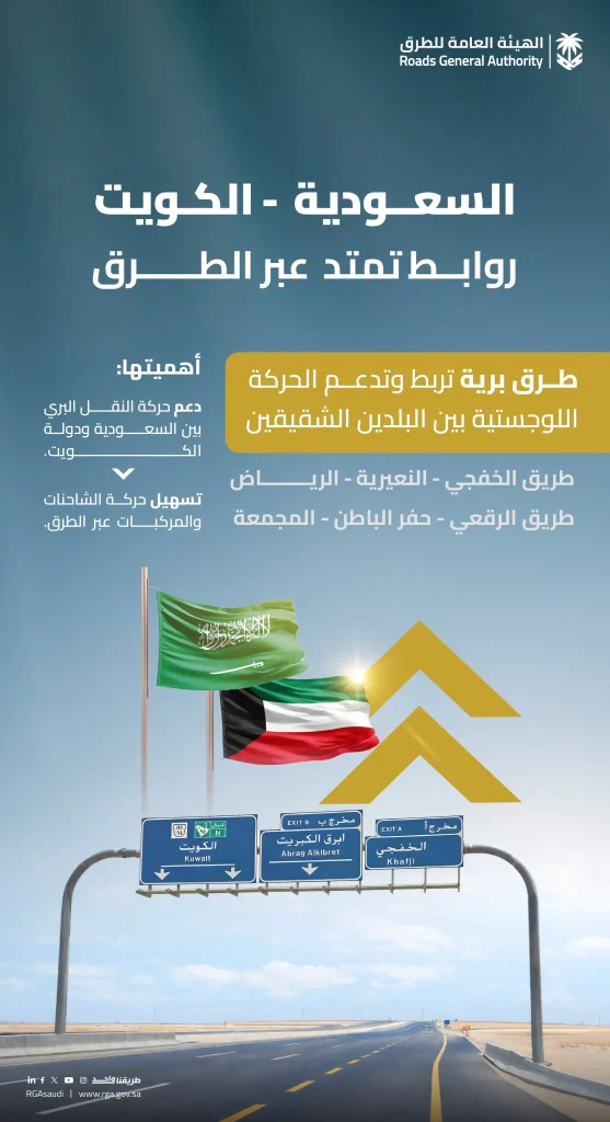 السعودية | تواصل الهيئة العامة للطرق السعودية جهودها لتعزيز الربط البري بين المملكة والكويت، عبر مسارات رئيسية تشمل طريقي الخفجي والرقعي، لضمان أعلى مستويات الكفاءة في التنقل.