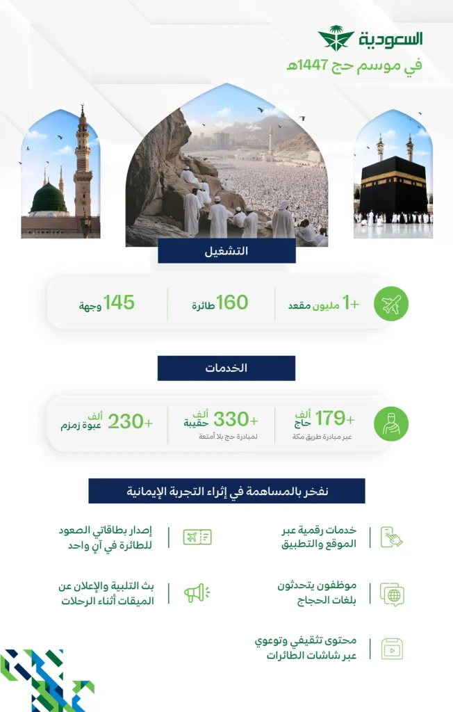 - الأسطول الجوي: تخصيص 160 طائرة مجهزة لنقل الحجاج.