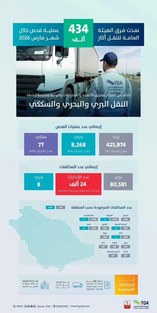 السعودية | أنذرت الهيئة العامة للنقل TGA أكثر من 24 ألف ناقل مع منحهم فرصة لتصحيح مخالفاتهم قبل تطبيق العقوبات بحقهم، وذلك عبر 434 ألف عملية فحص رقابية نفذتها خلال شهر مارس في المملكة، بهدف معالجة الملاحظات ورفع مستوى السلامة، وتقديم خدمات عالية الجودة في أنشطة النقل.