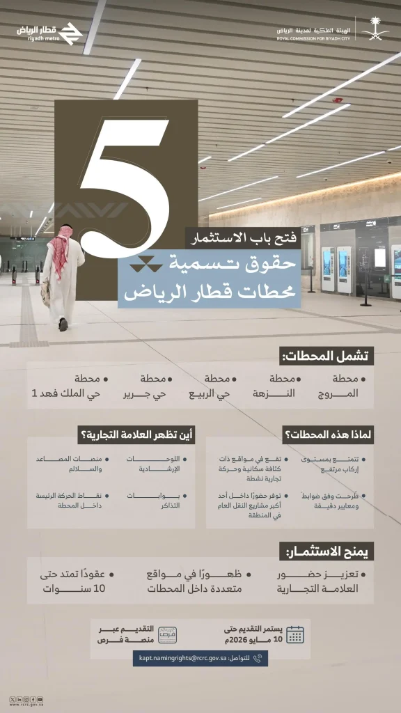 السعودية | أعلنت الهيئة الملكية لمدينة الرياض عن طرح مزايدة استثمارية لاستثمار حقوق تسمية خمس محطات رئيسة ضمن مشروع قطار الرياض، منها: المروج، والنزهة، وحي الملك فهد 1، والربيع، وحي جرير، وسيبدأ الطرح في المجموعة الأولى بخمس محطات وهي المروج وحي الملك فهد 1 والنزهة والربيع وحي جرير، وذلك بعقود تمتدُّ لفترات زمنية طويلة لعشر سنوات، داعية المستثمرين من القطاع الخاص على المستويين المحلي والدولي للمشاركة، وفق ضوابط ومعايير دقيقة تتماشى مع كبرى مشاريع النقل العام الدولية.