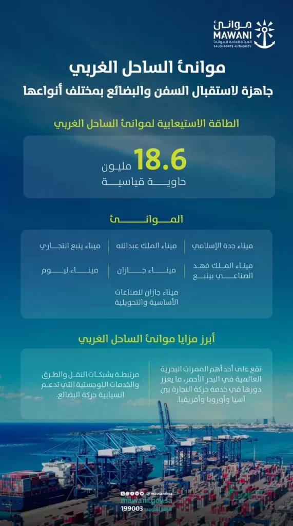 بقدرة استيعابية تتجاوز 18 مليون حاوية.. موانئ الساحل الغربي السعودي تعزز كفاءة سلاسل الإمداد العالمية