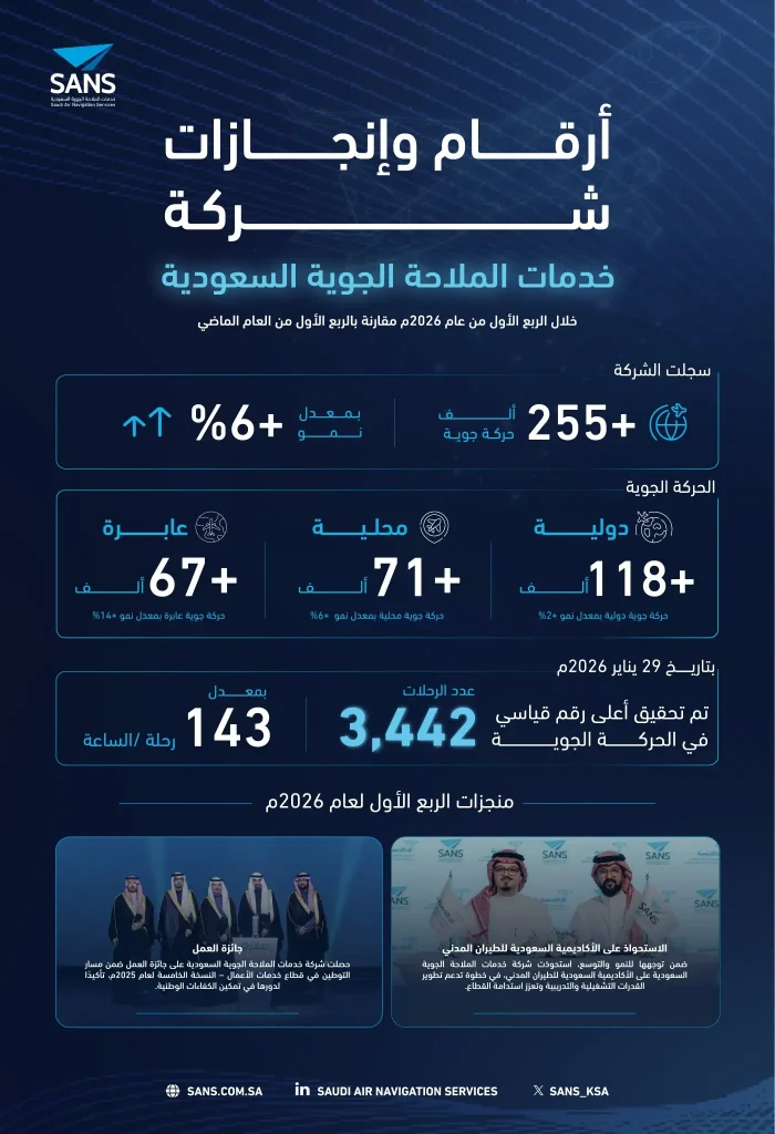 السعودية | كشفت كشفت شركة خدمات الملاحة الجوية السعودية (SANS) عن تقريرها التشغيلي للربع الأول من عام 2026، والذي سجل طفرة في الأداء ومعدلات النمو مقارنة بالفترة نفسها من العام الماضي.