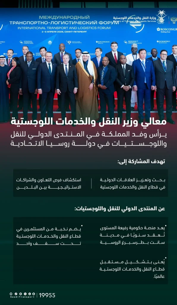 السعودية | ترأس معالي وزير النقل والخدمات اللوجستية، المهندس صالح بن ناصر الجاسر، وفد المملكة العربية السعودية المشارك في أعمال “المنتدى الدولي للنقل واللوجستيات” المنعقد في مدينة سانت بطرسبرغ بجمهورية روسيا الاتحادية، وذلك في خطوة تهدف إلى تعزيز العلاقات الثنائية واستكشاف فرص التعاون الاستراتيجي في قطاع النقل بين البلدين.