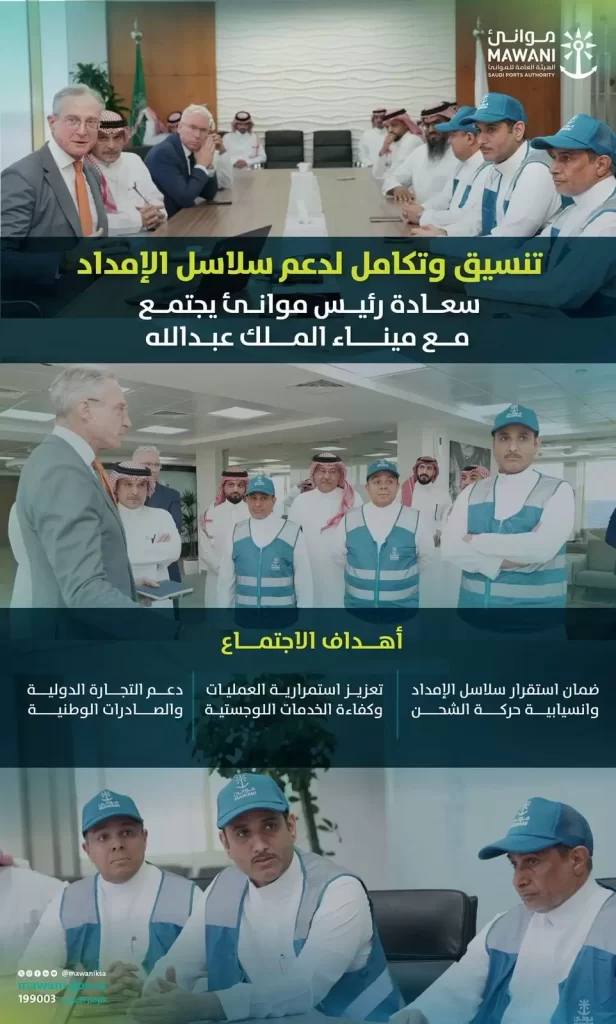 السعودية | عقد سعادة رئيس موانئ، م. سليمان خالد المزروع اجتماعًا مع سعادة الرئيس التنفيذي لميناء الملك عبدالله السيد جاي نيو؛ لبحث تكامل موانئ المملكة وتعزيز كفاءة واستقرار سلاسل الإمداد، والاطلاع على الخدمات اللوجستية في ميناء الملك عبدالله بما يدعم انسيابية حركة التجارة الدولية ونمو الصادرات الوطنية، واستعراض القدرات التشغيلية للميناء.