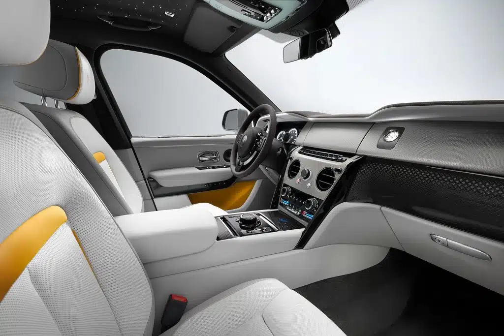 من جهة أخرى، تجسّد مجموعة “فيوشن” آخر صيحات الموضة بما يعكس طابع بلاك بادج الجريء، كما تتخلّلها مزايا عمليّة رائعة. استوحيت مجموعة “فيوشن” من مجموعات الملابس الجاهزة لموسم ربيع/صيف 2023، حيث تمّ تزيينها بعناصر عمليّة تحاكي الملابس المريحة وجرى تصميمها لتعكس طابع كالينان المتمثل في التنقّل بفخامة سهلة على كلّ التضاريس.ابتكر مصمّمو “فيوشن” أسلوبَين مميّزين للمقصورة الداخلية، الأول عبارة عن توليفة آسرة من الأخضر العسكري والأزرق النيلي والبرتقالي، والثاني مزيج رائع من الأبيض الناصع والجلد الرمادي الكشميري مع لمسات من الأصفر الخردلي. وبحسب التصميم الداخلي المختار، يمكن تنسيق سيارات مجموعة “فيوشن” مع واحد من أربعة ألوان للهيكل الخارجي، ألا وهي الأخضر العسكري، والرمادي المحروق والأصفر الخردلي والرمادي الفاتح.