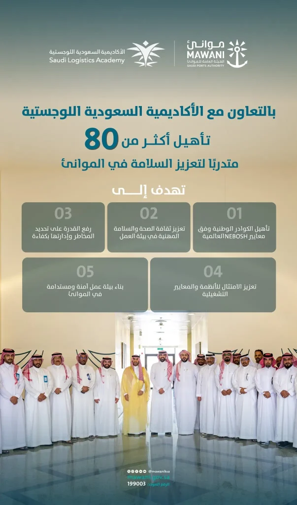 السعودية | أعلنت الأكاديمية السعودية اللوجستية، بالتعاون مع الهيئة العامة للموانئ (موانئ)، عن إطلاق برنامج تدريبي تخصصي يهدف إلى تأهيل أكثر من 80 متدرباً من منسوبي الهيئة للحصول على شهادة NEBOSH الدولية في الصحة والسلامة المهنية.