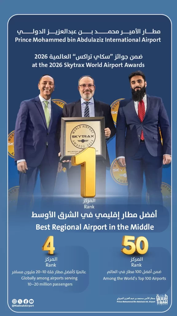 السعودية | سجل مطار الأمير محمد بن عبدالعزيز الدولي بالمدينة المنورة إنجازاً نوعياً جديداً في قطاع الطيران العالمي، بتحقيقه مراكز متقدمة ضمن جوائز “سكاي تراكس” العالمية (Skytrax World Airport Awards) لعام 2026.