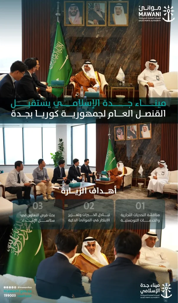 السعودية | استقبل ميناء جدة الإسلامي سعادة القنصل العام لجمهورية كوريا السيد/ وو هونغكو والوفد المرافق له، جرى خلال اللقاء بحث فرص التعاون في سلاسل الإمداد، مناقشة التحديات التجارية واللوجستية بين البلدين.