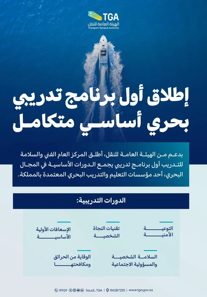 السعودية | أعلنت الهيئة العامة للنقل TGA، اليوم (الأربعاء)، إطلاق أول برنامج تدريبي بحري أساسي متكامل، بدعم من الهيئة، وذلك ضمن جهودها لتأهيل الكفاءات الوطنية ورفع مستوى السلامة البحرية.