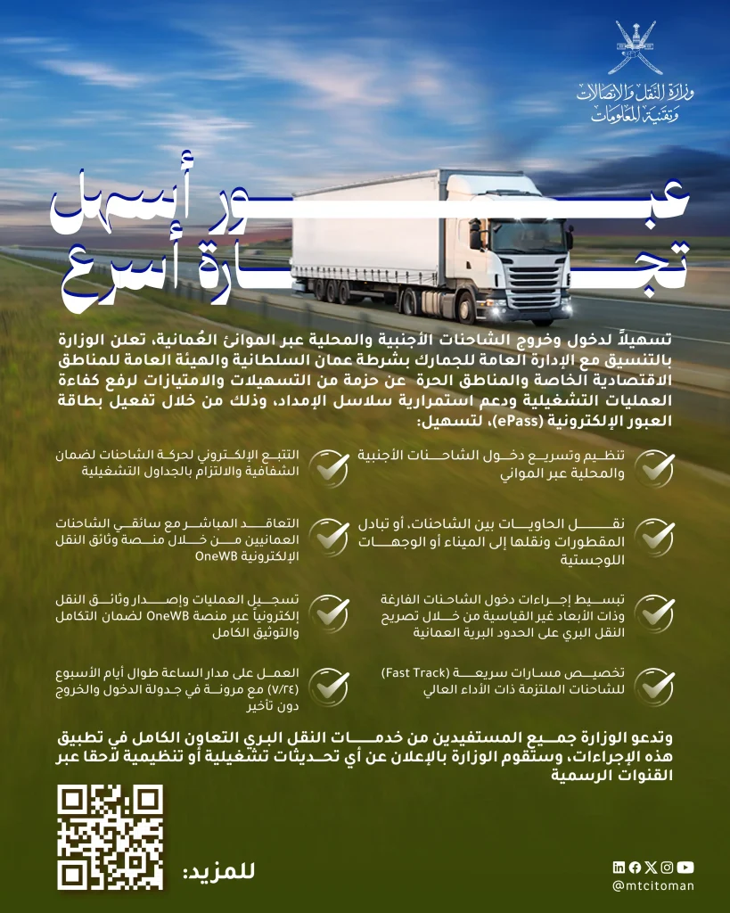 عُمان | أعلنت أعلنت وزارة النقل والاتصالات وتقنية المعلومات عن حزمة من التسهيلات الجديدة لدخول وخروج الشاحنات المحلية والأجنبية عبر الموانئ والمناطق الحرة والاقتصادية الخاصة، بالتنسيق مع الإدارة العامة للجمارك بشرطة عمان السلطانية والهيئة العامة للمناطق الحرة والمناطق الاقتصادية الخاصة.
