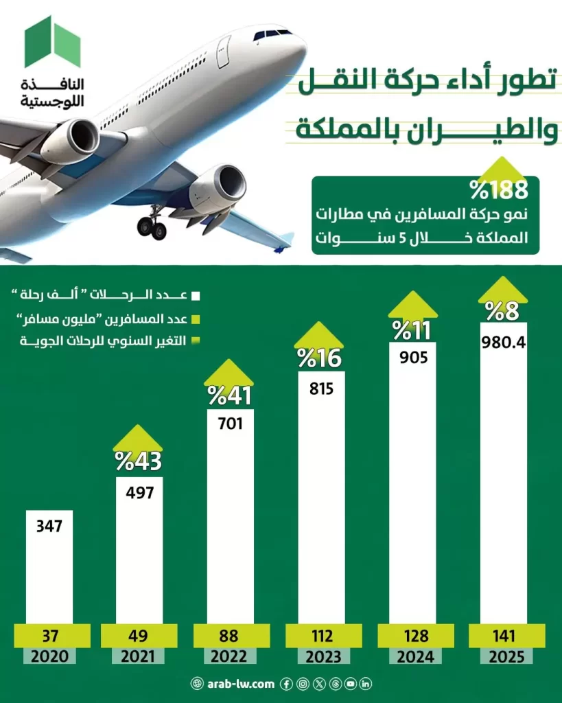أظهرت البيانات أن إجمالي عدد المسافرين عبر مطارات المملكة وصل إلى 141 مليون مسافر بحلول نهاية عام 2025، وذلك عبر 980.4 ألف رحلة جوية. وسجلت حركة الرحلات نمواً سنوياً بنسبة 8% مقارنة بالعام السابق (2024)، مما يؤكد الجاذبية المتزايدة للمملكة كوجهة عالمية للسياحة والأعمال.