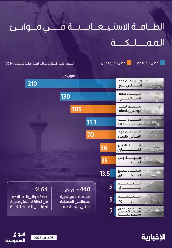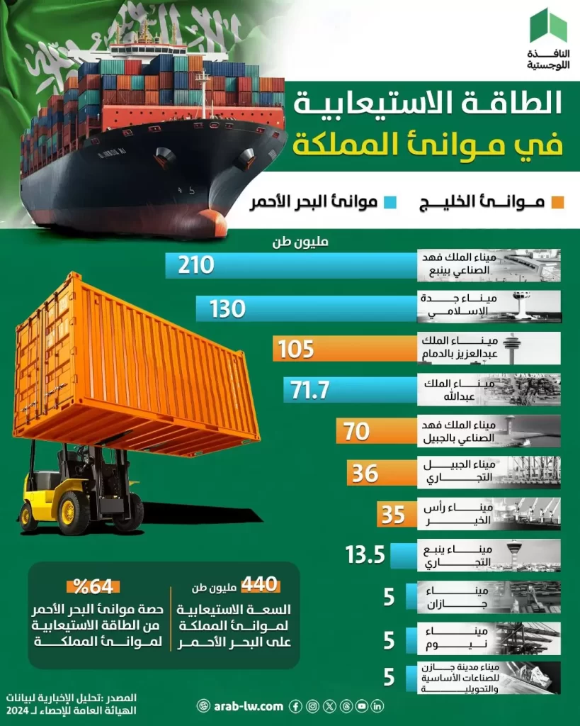 السعودية | كشفت بيانات إحصائية حديثة صادرة عن الهيئة العامة للإحصاء لعام 2024، عن تصدر موانئ البحر الأحمر للمشهد اللوجستي في المملكة العربية السعودية، حيث استحوذت على حصة الأسد بنسبة 64% من إجمالي الطاقة الاستيعابية لموانئ المملكة، وبقدرة إجمالية بلغت 440 مليون طن.