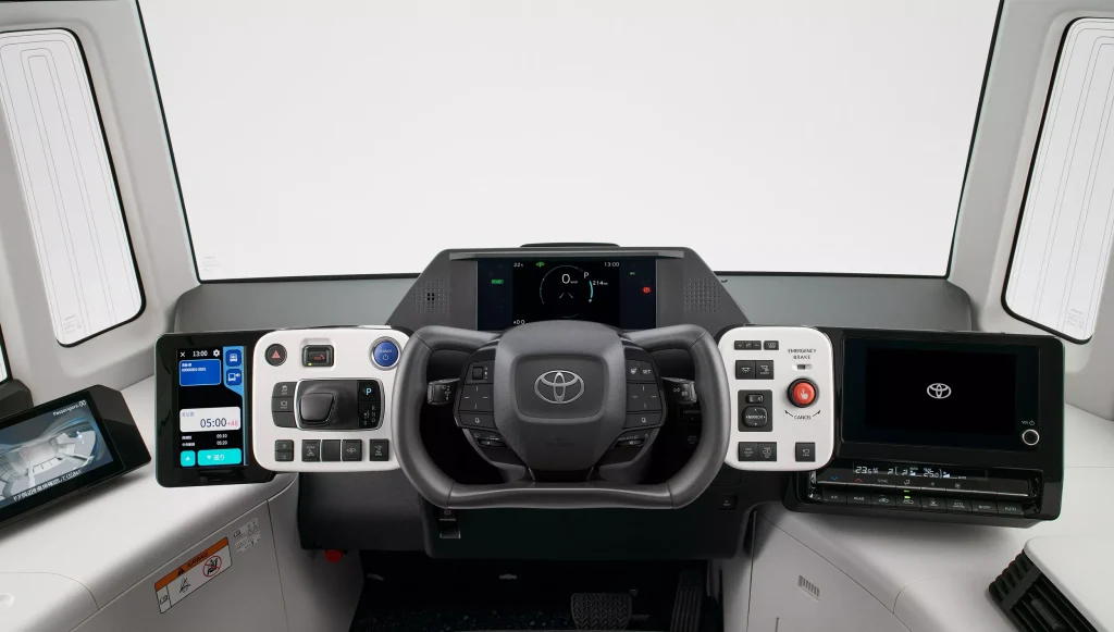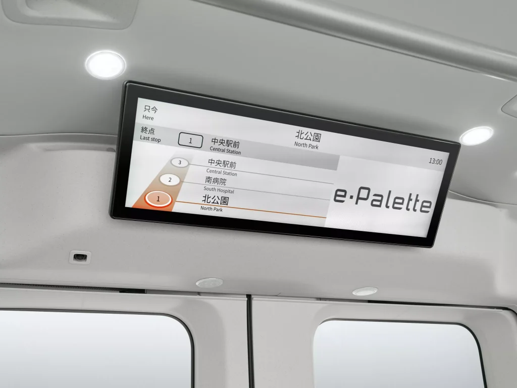 تتسع e-Palette لما يصل إلى 17 راكبًا بفضل تصميم داخلي مرن ومبتكر يتيح تعديل المقاعد وتخصيص المساحة وفقًا للاستخدام. أما من الناحية التقنية، فهي تعتمد على بطارية بقدرة 72.8 كيلوواط/ساعة توفر مدى قيادة يصل إلى 250 كيلومترًا، مع إمكانية الشحن السريع حتى 80% في غضون 40 دقيقة فقط، أو شحن كامل في 12 ساعة عبر منفذ عادي. كما زودت بمقعد قيادة مركزي ونظام توجيه إلكتروني متطور، إضافة إلى شاشات رقمية متعددة للتحكم في جميع وظائف المركبة.